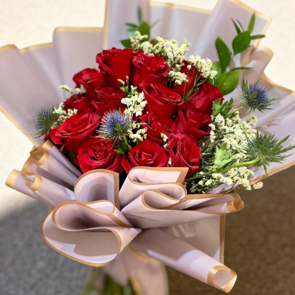 باقة من الورود الحمراء المبهجة مع لمسات من الأزهار الخضراء والنباتات الدقيقة، مغلفة بورق فاخر بألوان دافئة مع حواف ذهبية، مما يضفي لمسة من الفخامة والتميز.